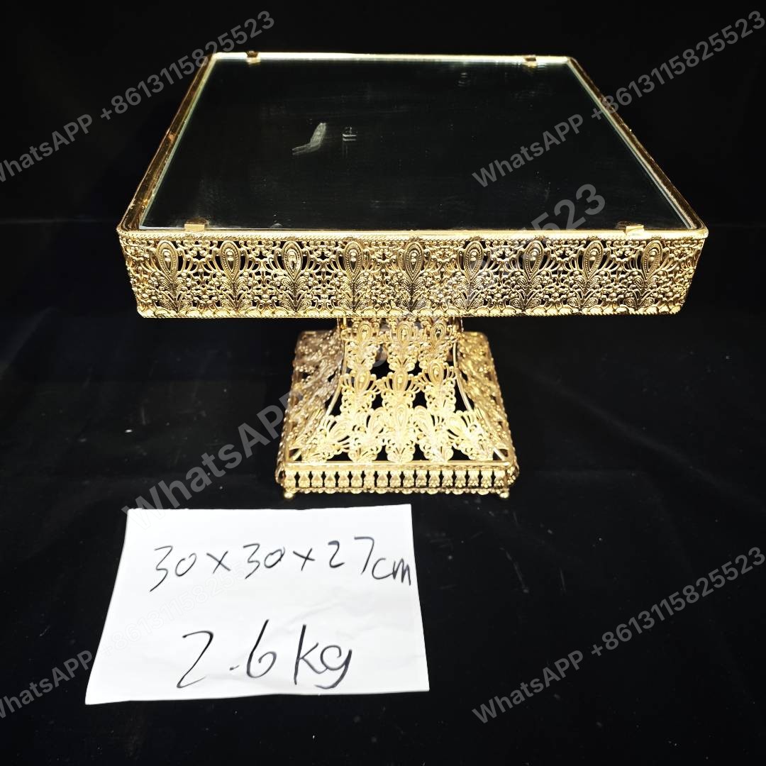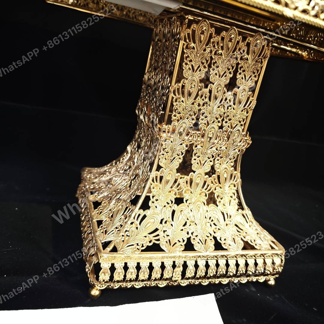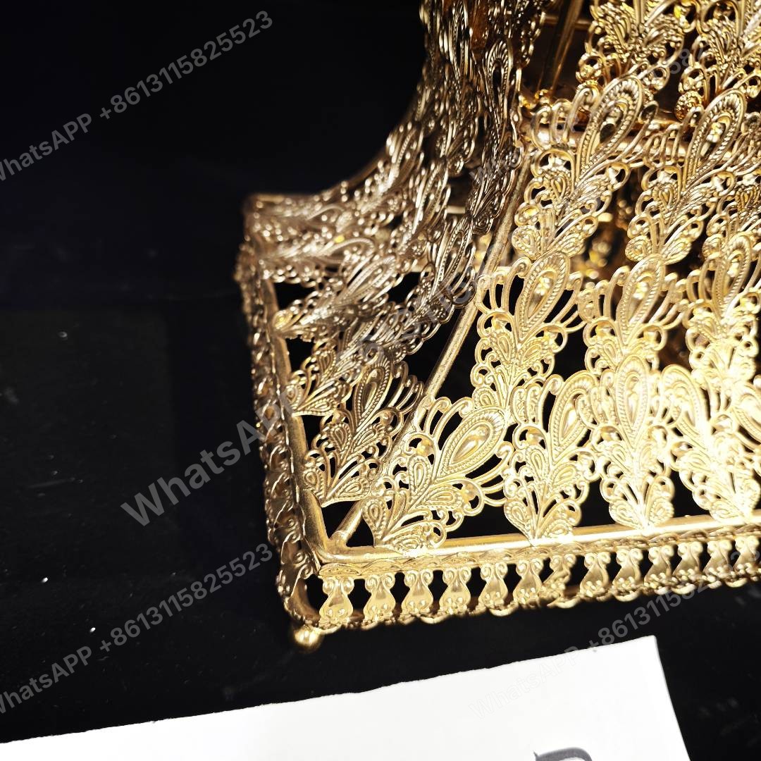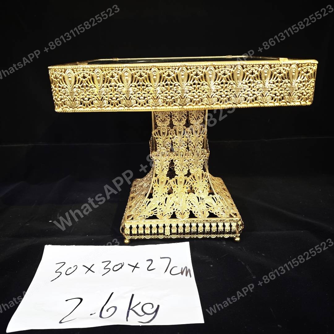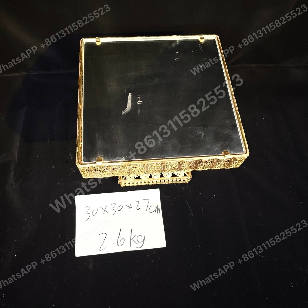 هذه الصينية المطلية بالذهب الأنيق مثالية للهدايا الإسلامية. بحجم 30x30x27 سم ووزن 2.6 كجم، وهي مثالية للطلبات بالجملة. مصنع مباشر مع كمية طلب أدنى متوفرة.